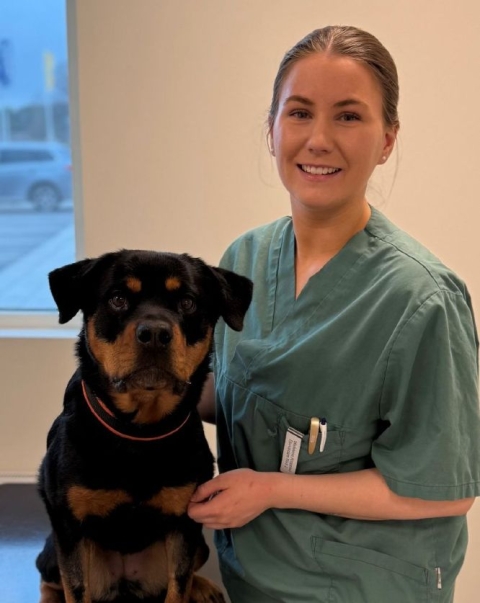 Emelie jobbar på operationsavdelningen samt med ortopeden. Hon har en Rottweilern Kitana och en Holländsk Herdehund Nyx som hon tränar/tävlar i bruks. Emelie har varit hos oss sedan 2017.