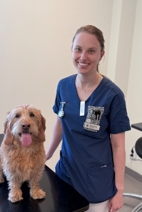 Karolina träffar ni på polikliniken hos oss. Hon tar emot hundar, katter och smådjur. Fritiden spenderas mycket i stallet eller i skogen med sin schäfer Keela.